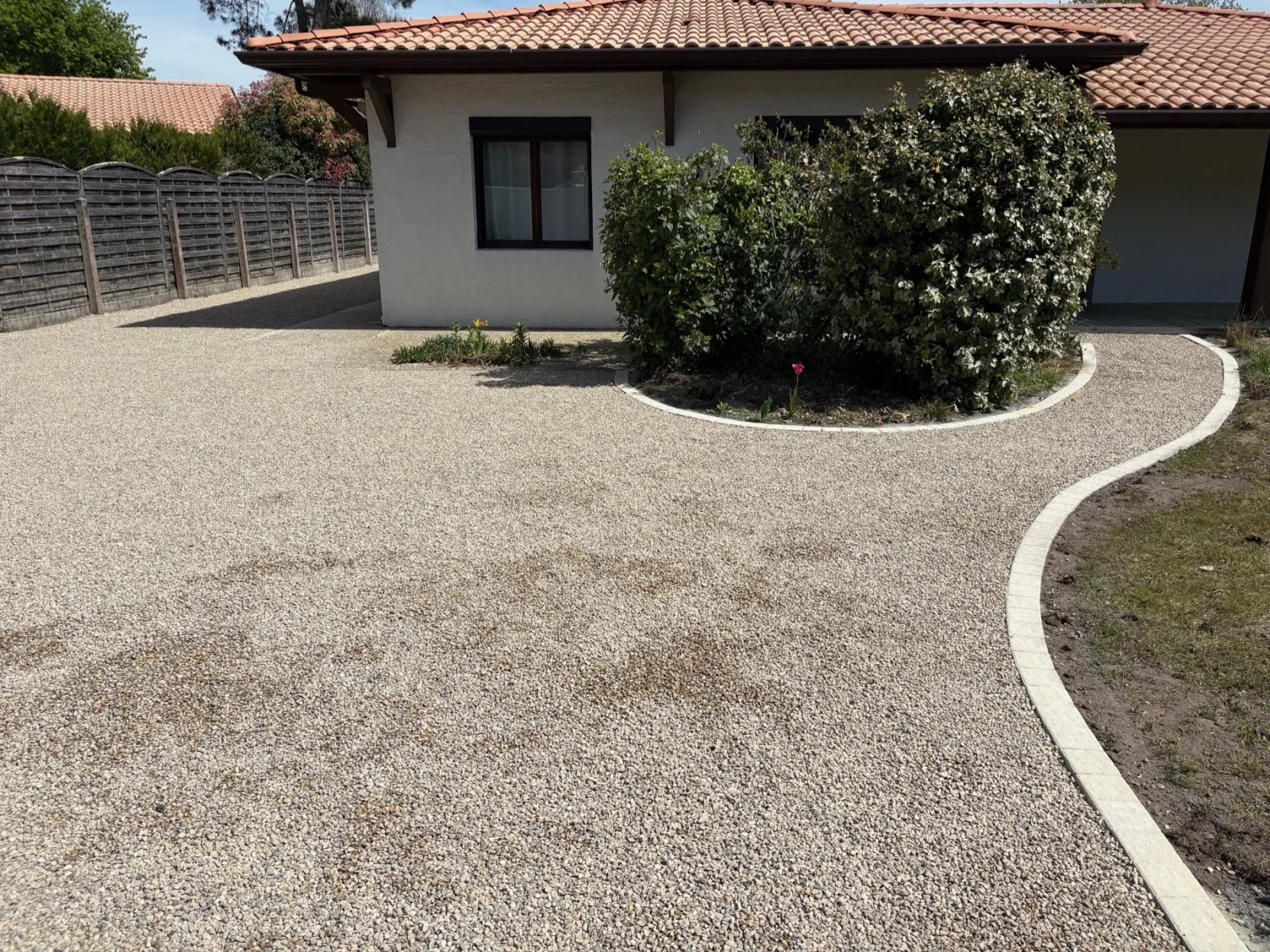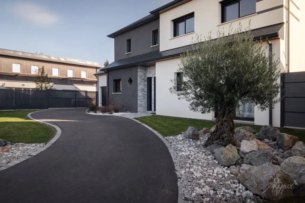 Allée entièrement refaite en enrobé à chaud. La surface est parfaite et l’écoulement de l’eau est bien pensé.